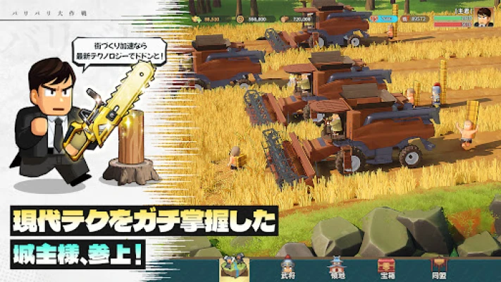 自分だけの城を築き、領民を豊かにする資源収集もシンプル。木を切り、麦を刈り、タップ一つで必要な物資を効率良く手に入れられます。気の合う仲間と気軽に同盟を結成し、「飲み友」のように親睦を深めるのも醍醐味です。力を合わせ、広大なマップの城を攻略し、最終目標である洛陽の制覇を目指してください。全国のプレイヤーと共に、乱世の覇者となる壮大な物語を紡ぎましょう。