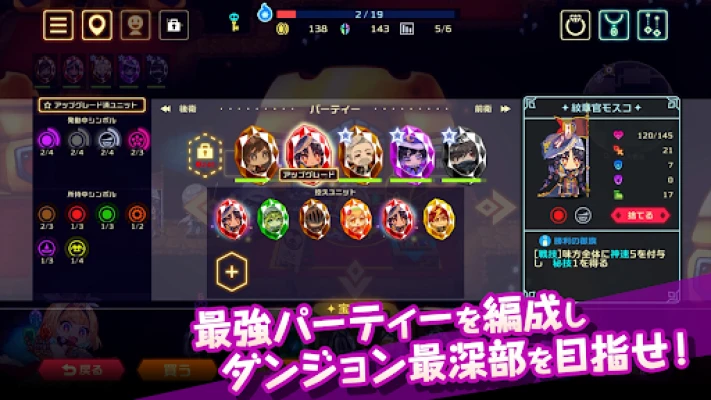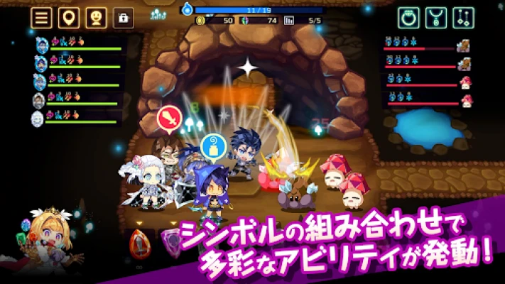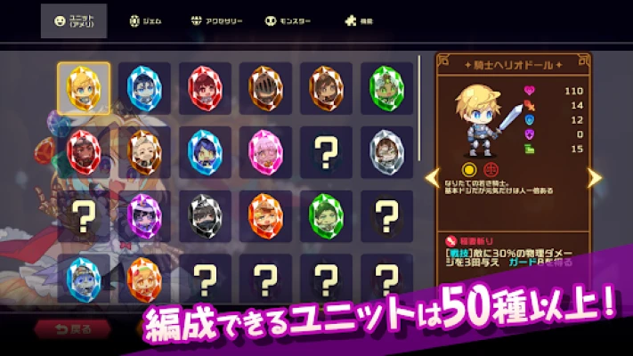 冒険の途中で見つけるのは、秘められた力を宿す美しい「宝石(ユニット)」。これらはあなたの忠実な仲間となり、同じ輝きを集めるほどその力は増していきます。各ユニットが持つ「カラー」と「マーク」を戦略的に組み合わせることで、「シンボルアビリティ」が目覚め、戦況を一変させる強力な効果を発動。無限の可能性を秘めた、あなただけの最強の騎士団を編成し、あらゆる敵に立ち向かいましょう。